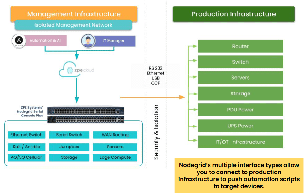 - Isolated management infrastructure (IMI). Nodegrid OOB fully segments the management network from production and enables automatic patching, blocking attack movements while locking out the latest threats.